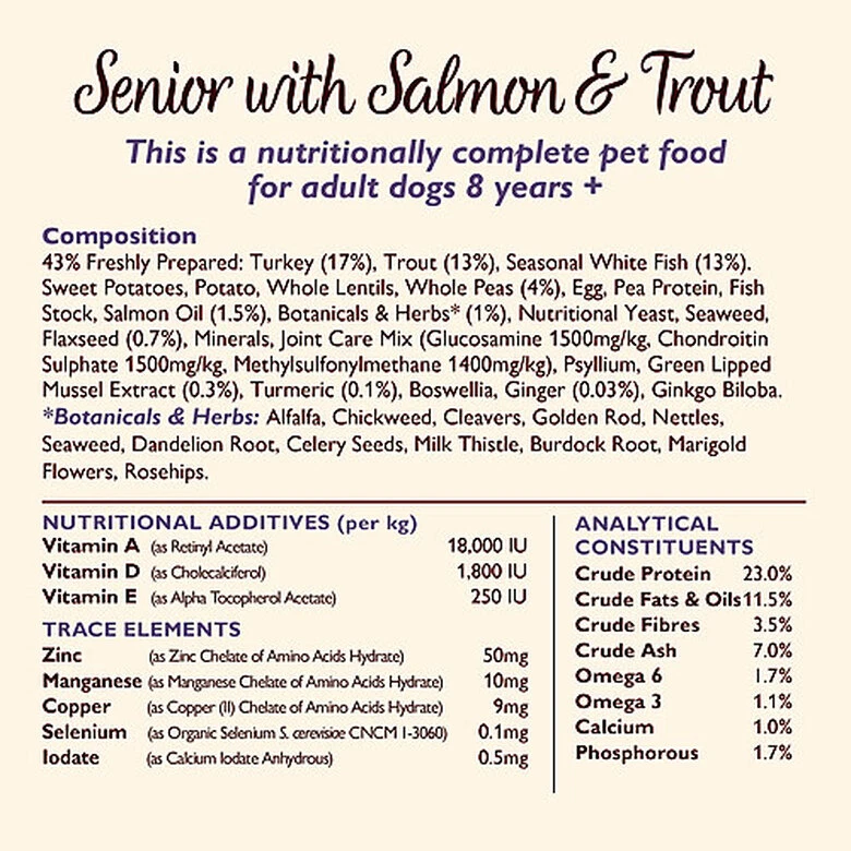 Composée à 43% de dinde, de truite et de délicieux poisson blanc, cette recette sans céréales est remplie de suppléments agissant sur les articulations pour donner à votre fidèle compagnon le repas le plus nutritif qui soit.