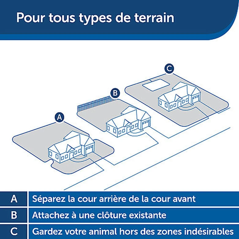 Un signal radio est transmis le long d’un fil enterré, délimitant le périmètre que vous souhaitez établir pour votre chien. Votre chien porte un collier-récepteur qui détecte le signal à la limite.