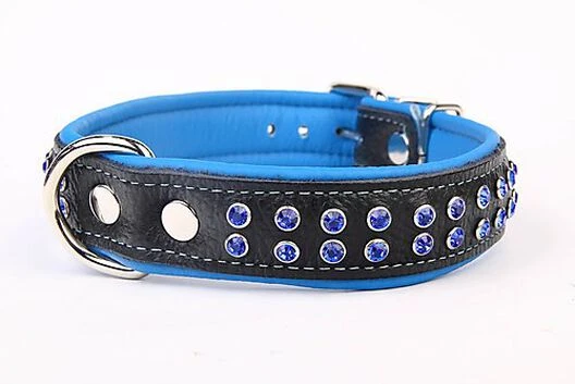 Collier de haute qualité tout en cuir véritable avec strass colorés pour chien. Chaque collier comprend un anneau en D solide et soudé. Les matières premières utilisées pour la production proviennent de fournisseurs européens.